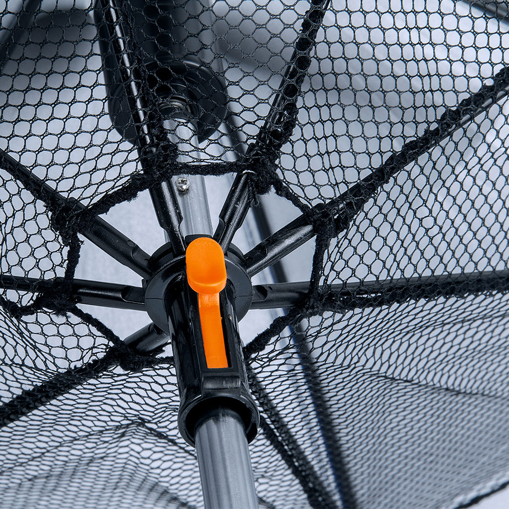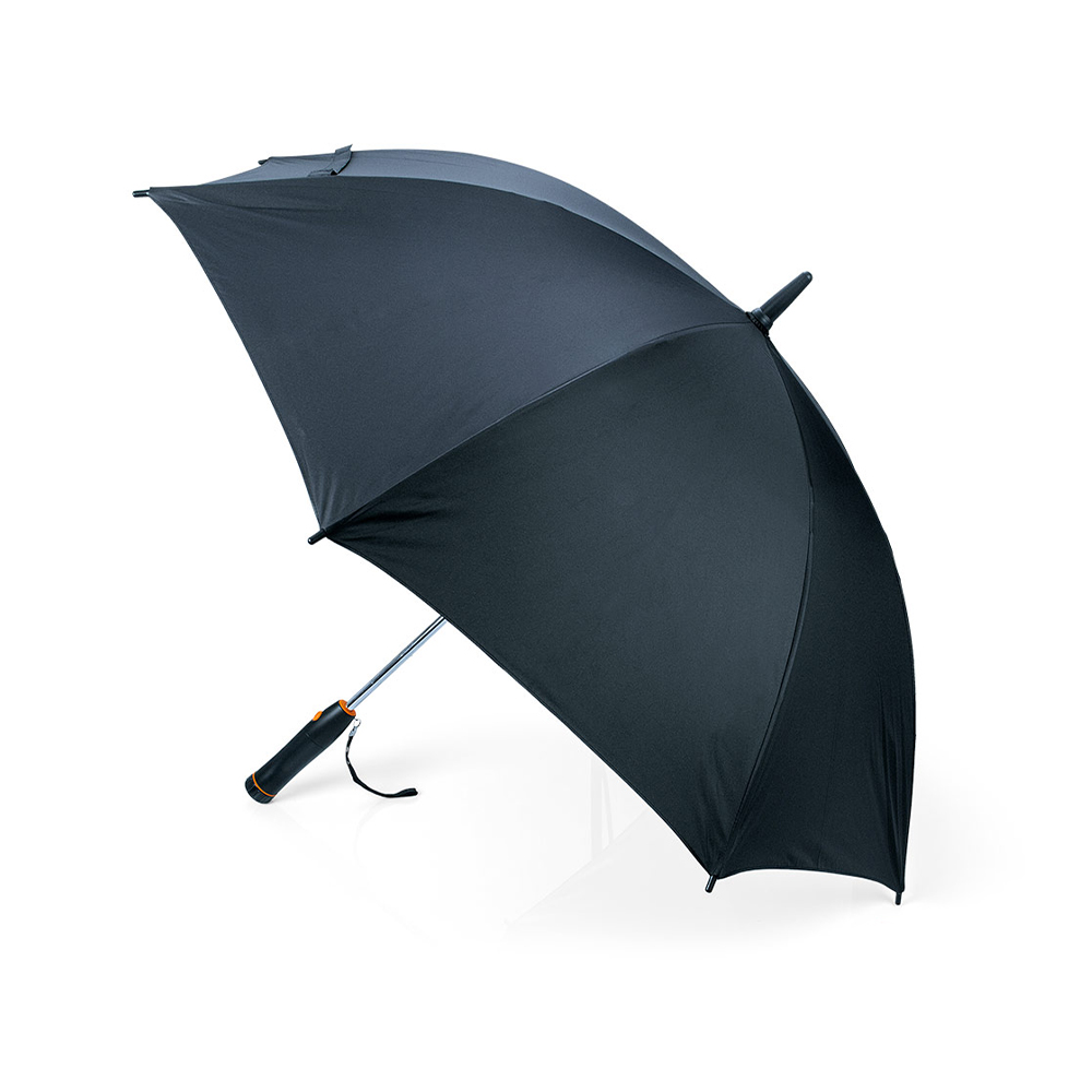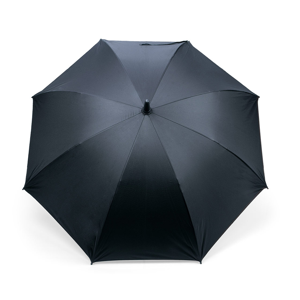 Paraguas con ventilador incorporado, apertura y cierre manual, 8 cascos, costillas en metal y fibra de vidrio, vara metálica, tela en Pongee con cinta para cierre con velcro, cubierta en malla bajo el toldo para protección del ventilador, mango en ABS con botón para encender el ventilador (incorpora caja para 4 baterías AA No incluidas), con correa textil para muñeca, tacos y puntas plásticas.