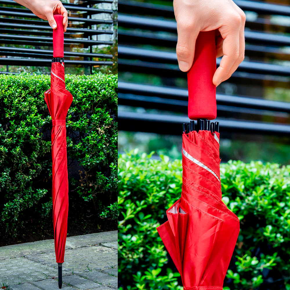 Paraguas tipo Golf con doble recubrimiento interior plateado. Apertura automática y cierre manual. Mango recto del mismo color de la tela.